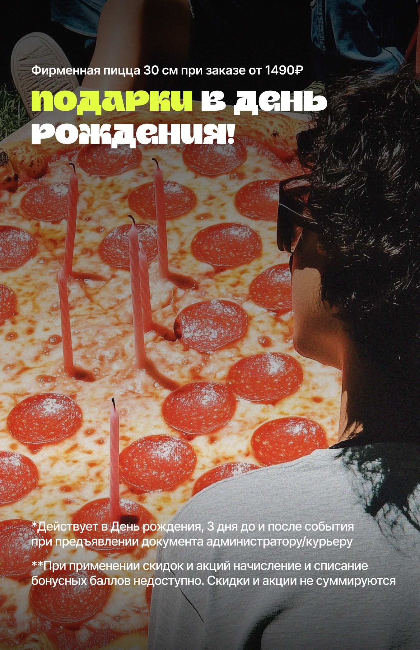 Фирменное тесто, томатный соус, сыр моцарелла, бекон, салями, кукуруза, паприка, корнишоны, соус гриль, красный лук, перец халапеньо
